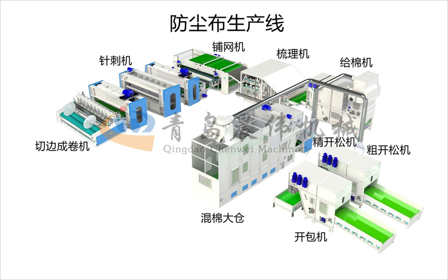 開包機(jī)-開松機(jī)-振動(dòng)給棉機(jī)-梳理機(jī)-鋪網(wǎng)機(jī)-針刺機(jī)-切邊成卷機(jī)