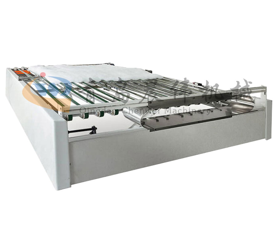 7. CWZT-裝套機(jī):將定好寬幅經(jīng)過(guò)烘箱定型成品的棉胎裝進(jìn)被套,自動(dòng)裝套。
